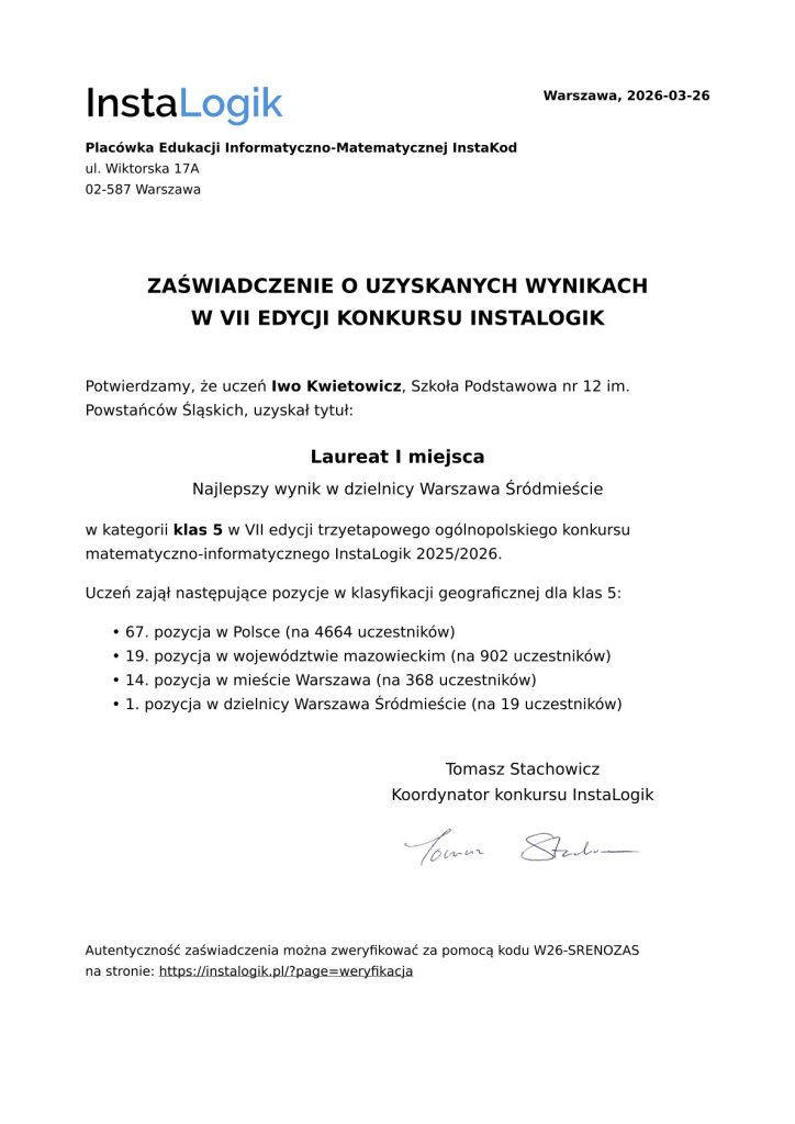 Z ogromną radością informujemy o wspaniałym sukcesie naszego ucznia Iwo Kwietowicza z klasy Vb, który zdobył tytuł Laureata I miejsca na szczeblu ogólnopolskim w kategorii klas V szkoły podstawowej w VII edycji trzyetapowego Ogólnopolskiego Konkursu Matematyczno-Informatycznego InstaLogik 2025/2026.